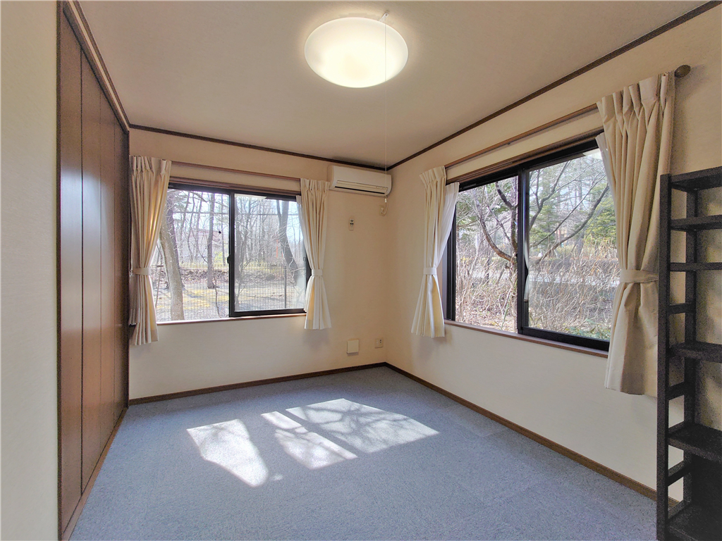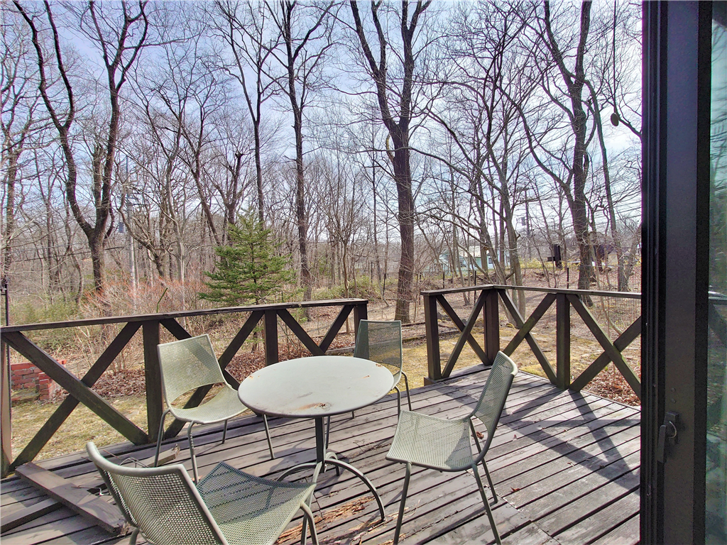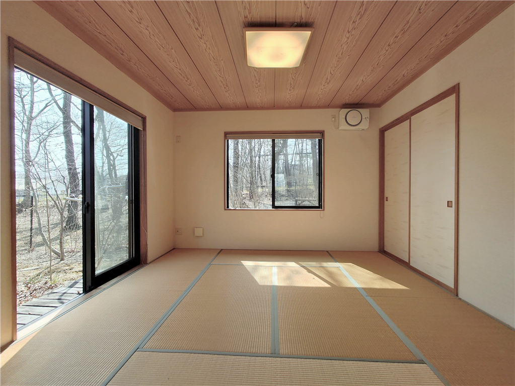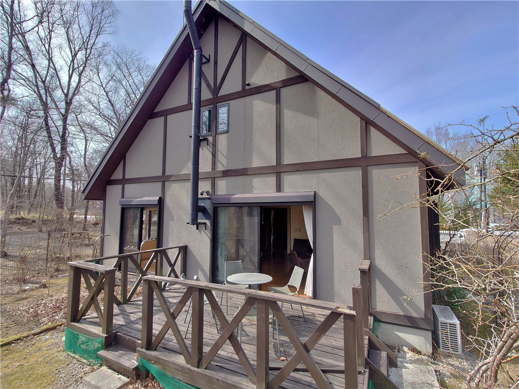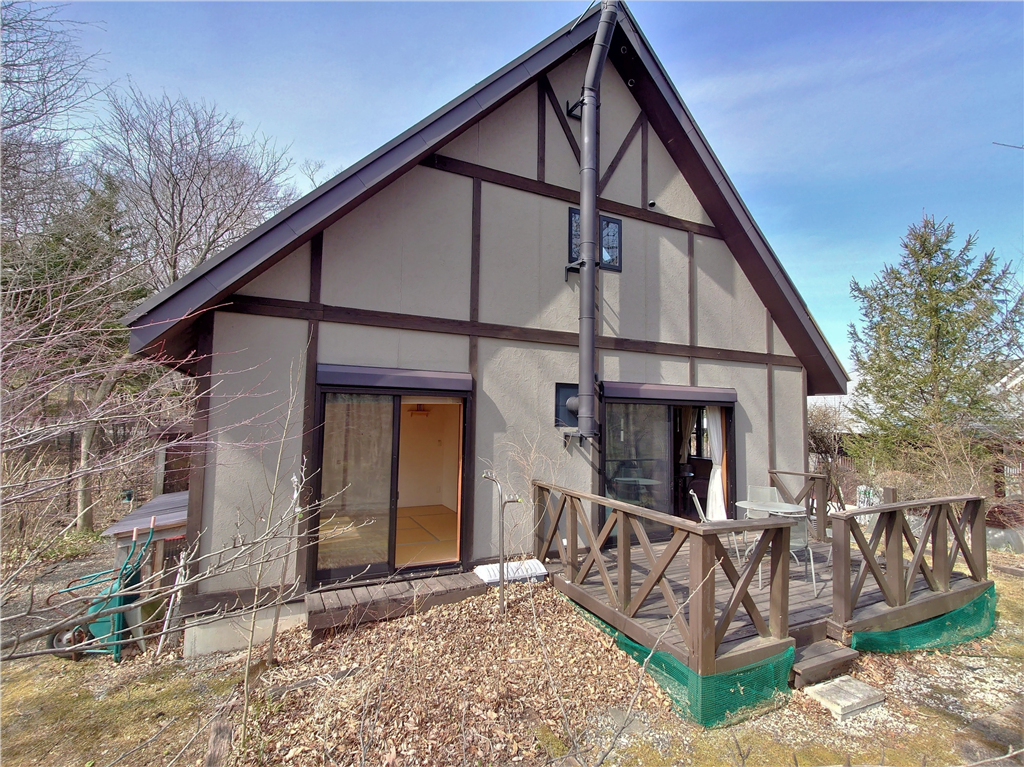 別荘地内メイン通り沿い。ウッドデッキより森林浴を愉しむ、平坦な敷地に建つ2LDKの一戸建て別荘。