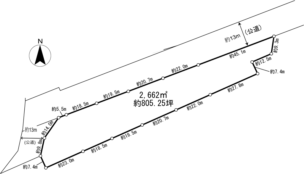 | 接面道路 | 北西側約13.0m(公道)舗装、南西側約13.0m(公道)舗装 | |