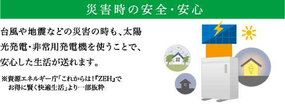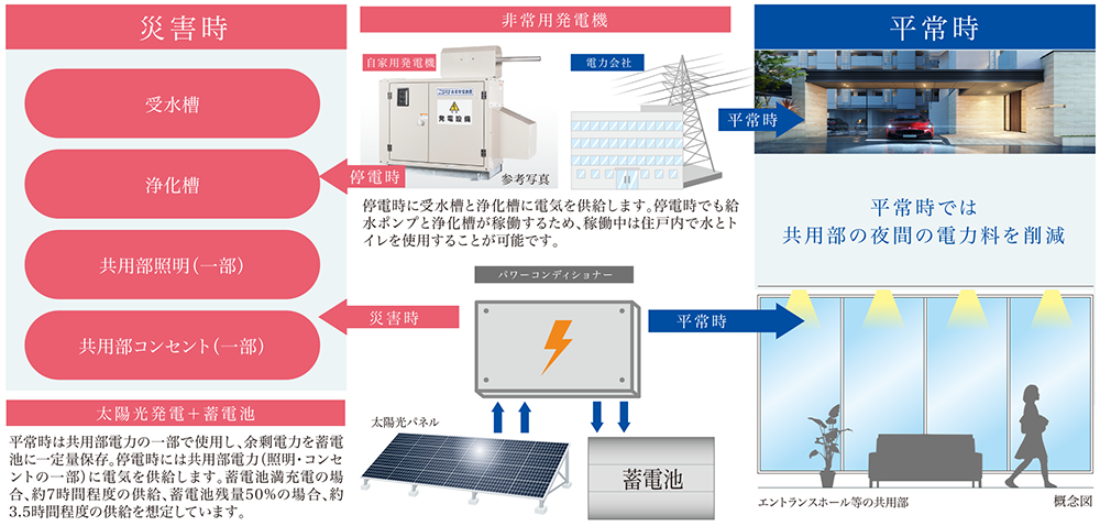 平常時は太陽光発電システムで共用部電源として使用し、共用部の電気料金を削減。災害時・停電時は、太陽光発電システムの電気をエントランス一部の非常時用照明・非常用コンセントに電気を送り、明かりとりやスマホの充電、簡易電気設備などが使用できるように備えています。