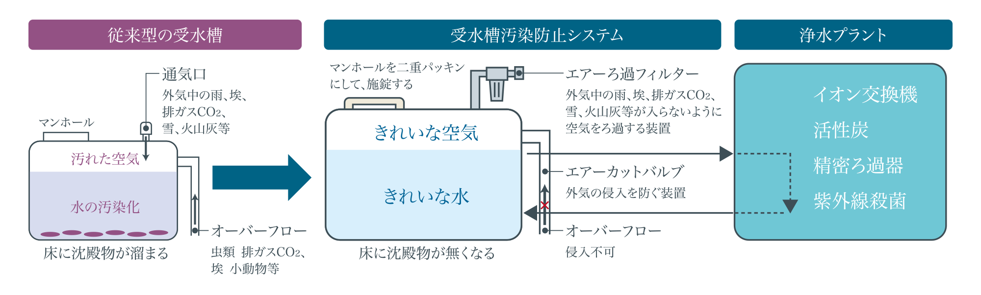 ◎受水槽汚染防止システムにより受水槽内に雨、埃や排ガスが入らないように空気をろ過します。