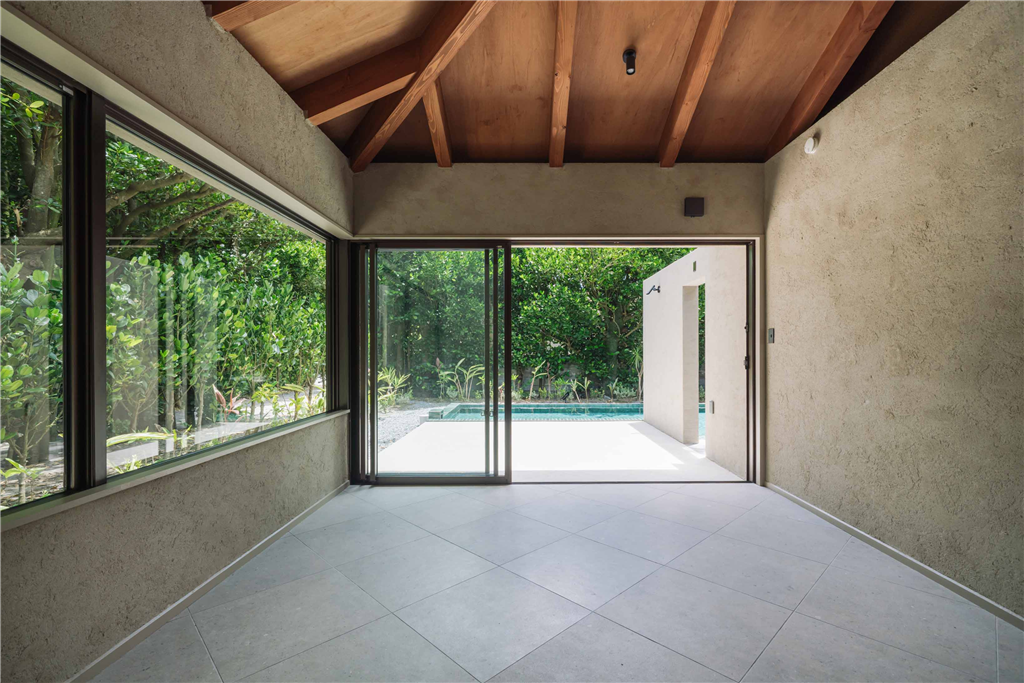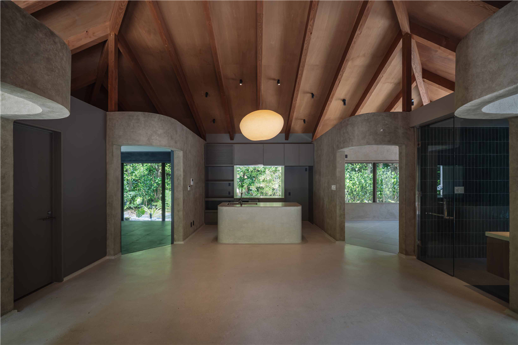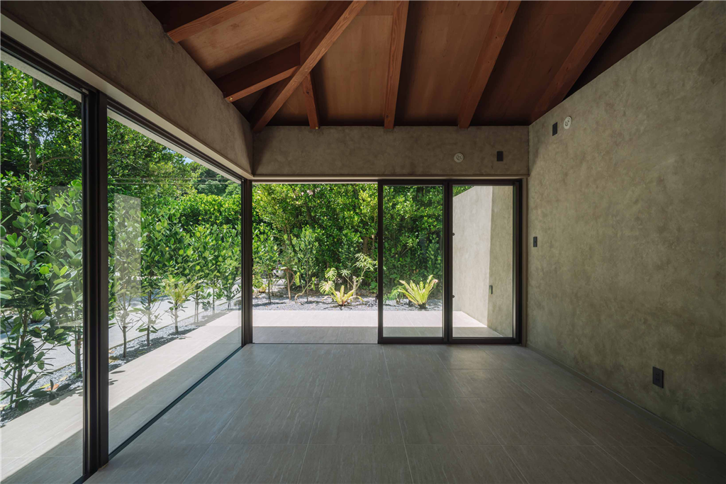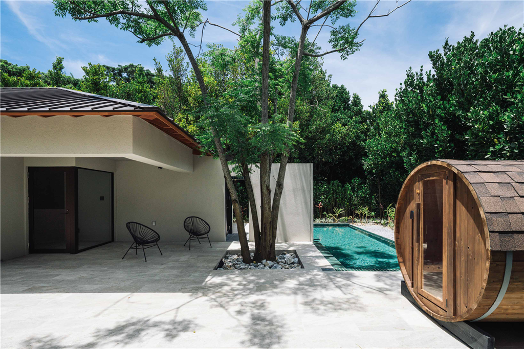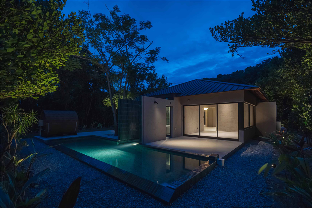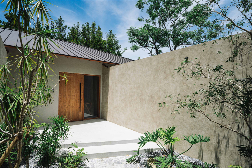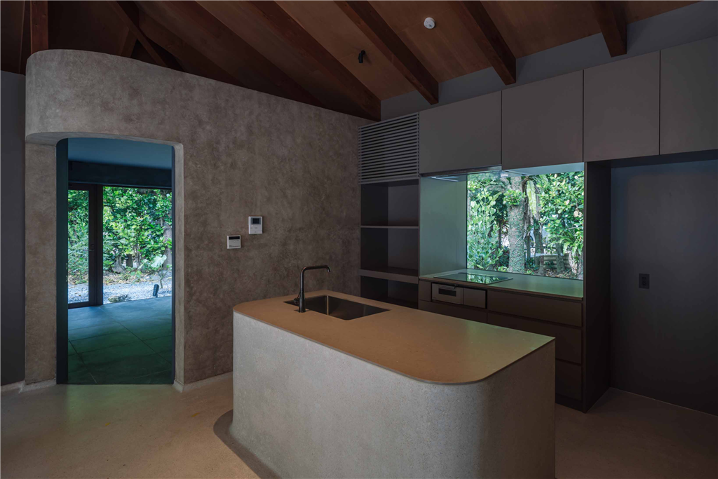 沖縄の原風景の一つ、フクギ並木に囲まれた199.36坪のゆとりある敷地に建つ平屋建て。庭にはプールやバレルサウナがありリゾート感たっぷり。アイランドスタイルのキッチンはシンクとIH調理台を分けたⅡ型設計で作業スペースを確保しています。
