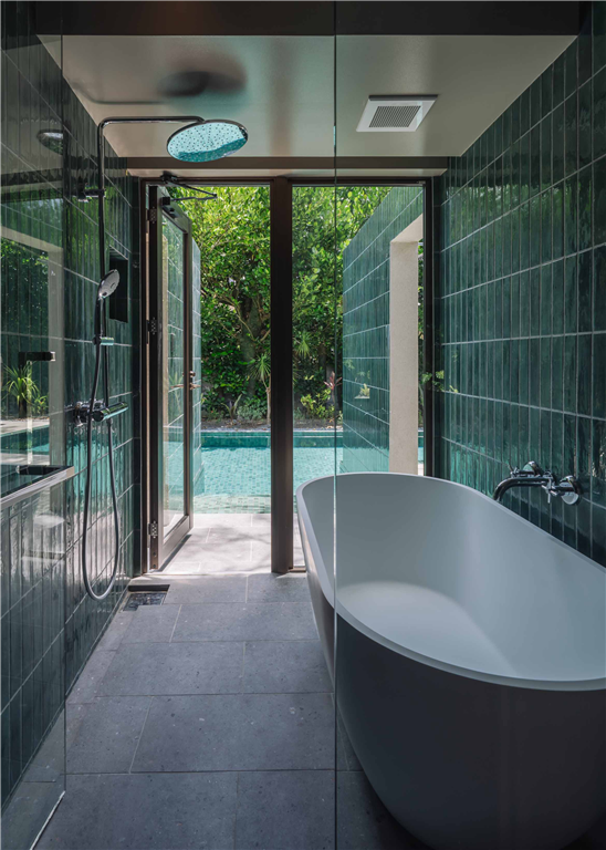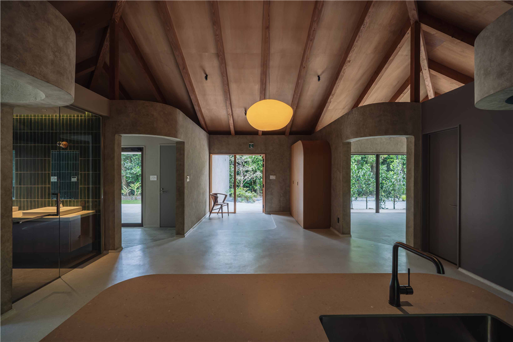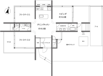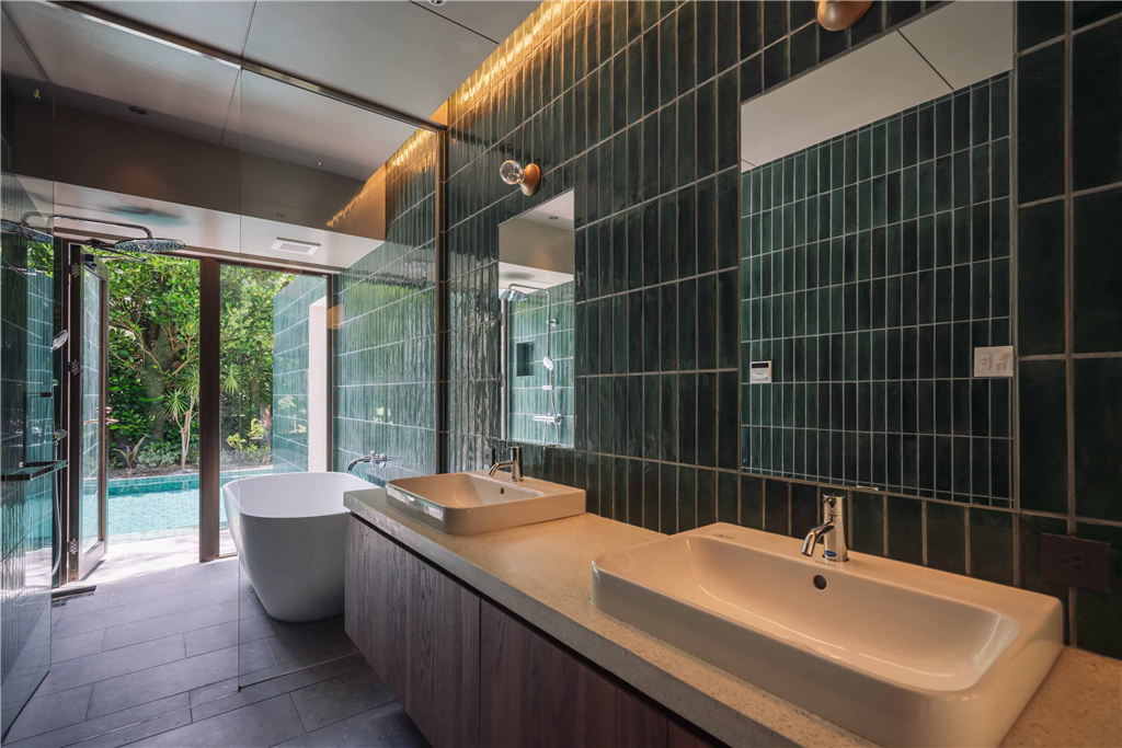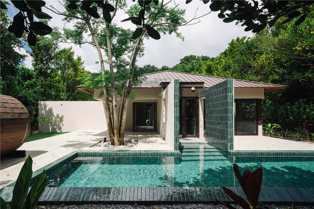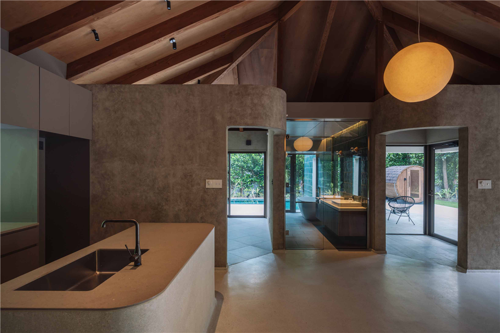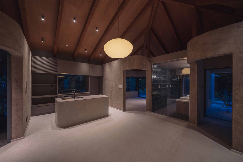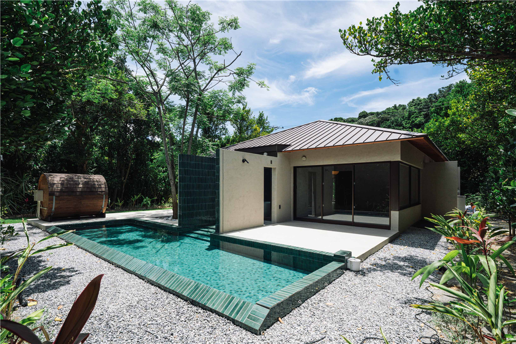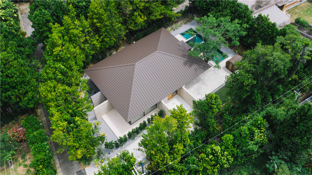 沖縄の原風景の一つ、フクギ並木に囲まれた199.36坪のゆとりある敷地に建つ平屋建て。庭にはプールやバレルサウナがありリゾート感たっぷり。アイランドスタイルのキッチンはシンクとIH調理台を分けたⅡ型設計で作業スペースを確保しています。