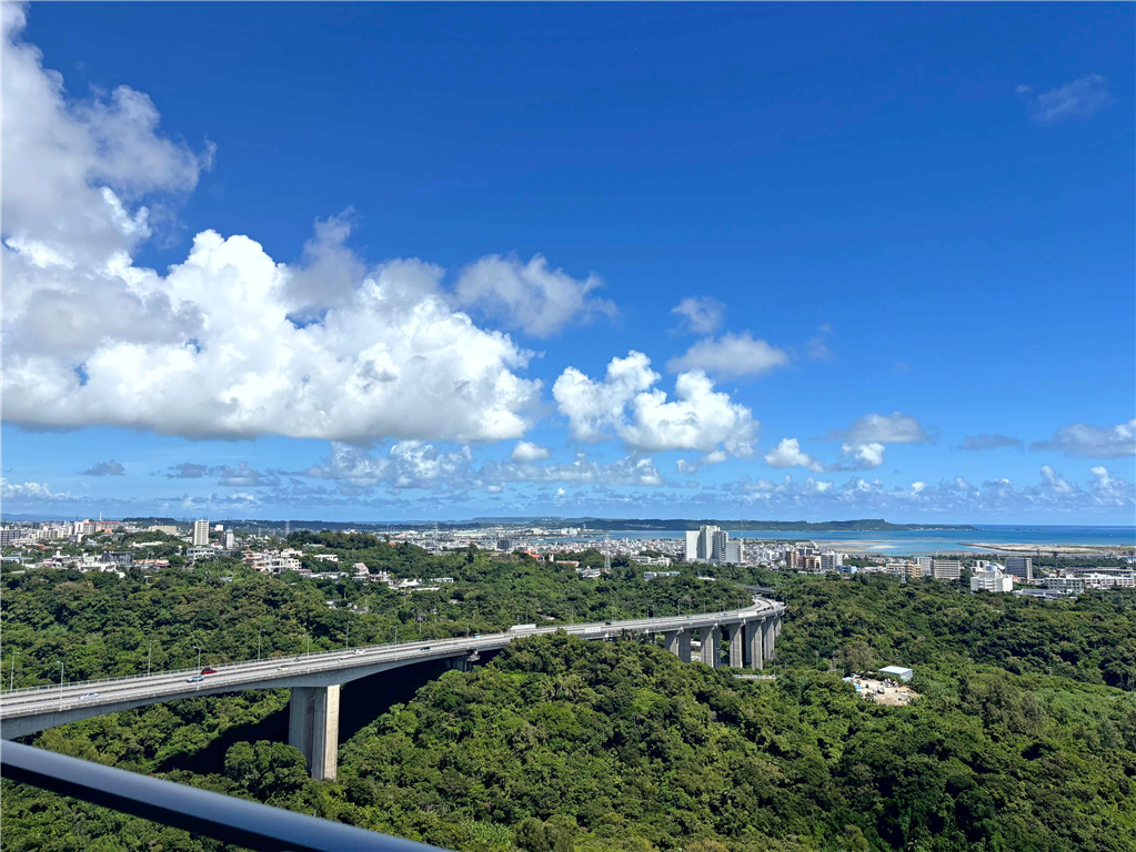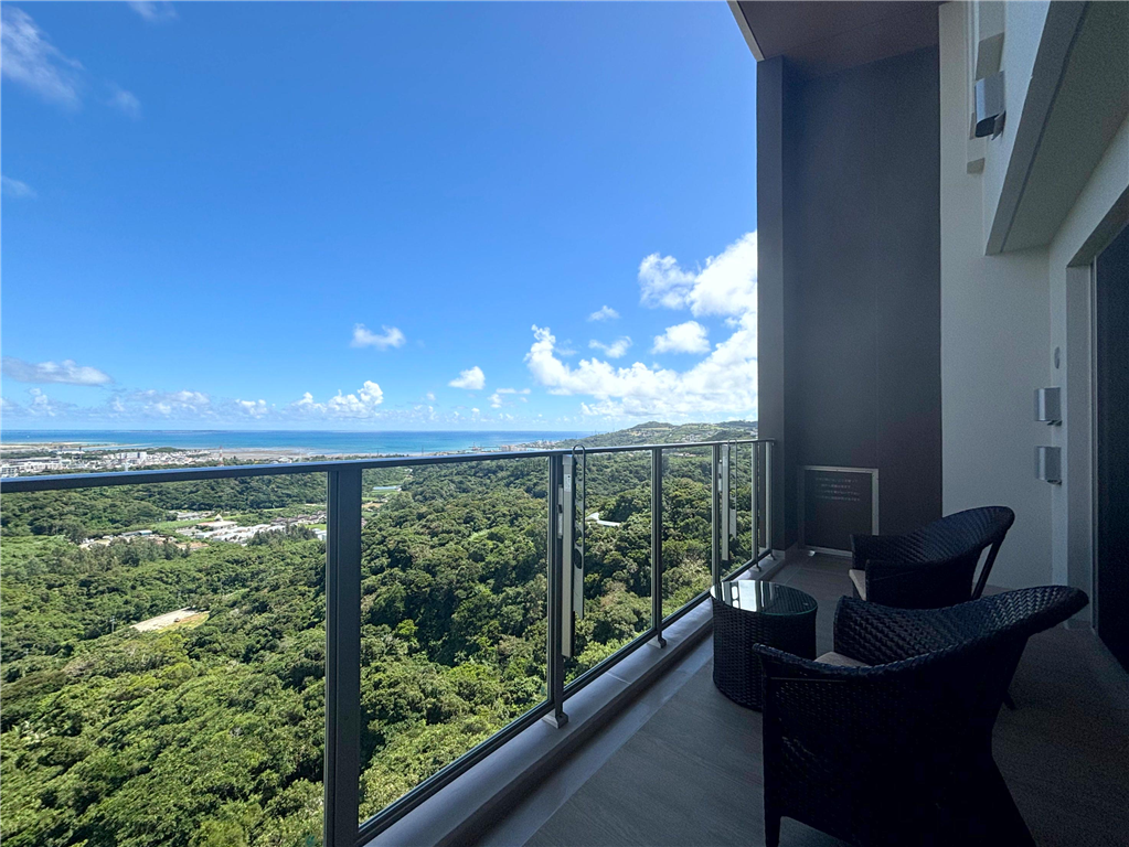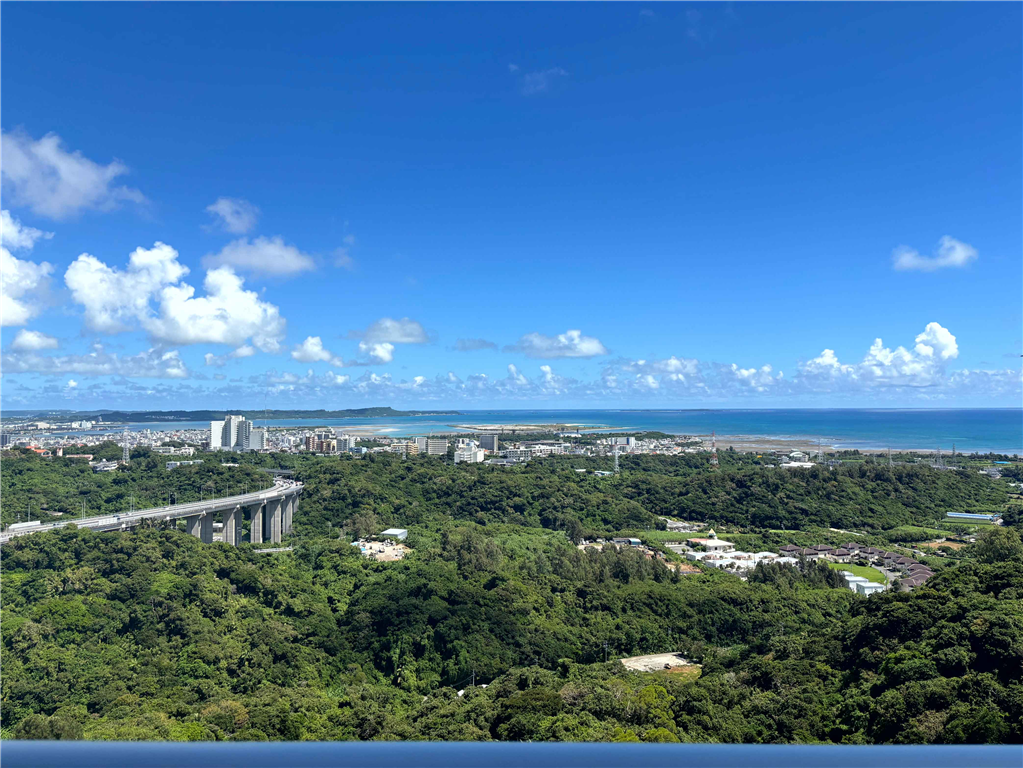 ライカムの高台(標高約90m)から広がる自然豊かな緑地と勝連半島、太平洋の遠景をお愉しみください。朝は日の出のビュー、日中は森林越しの青い空・青い海のビュー、夜は星空に月夜のビューを楽しめます!