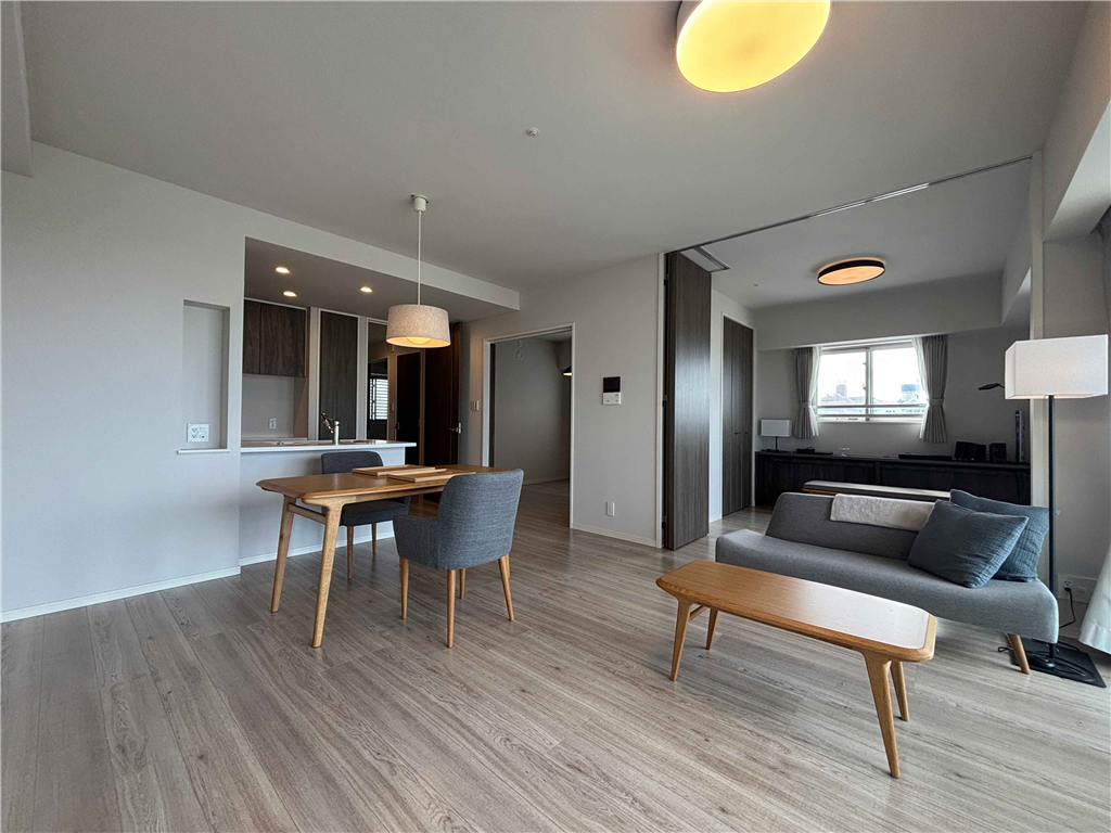 フラットにつながるLDKと洋室3から海を望む6階住戸。玄関前にはプライベート感のある大型ポーチ(8.91m2)あり。2024年1月築のマンションです。