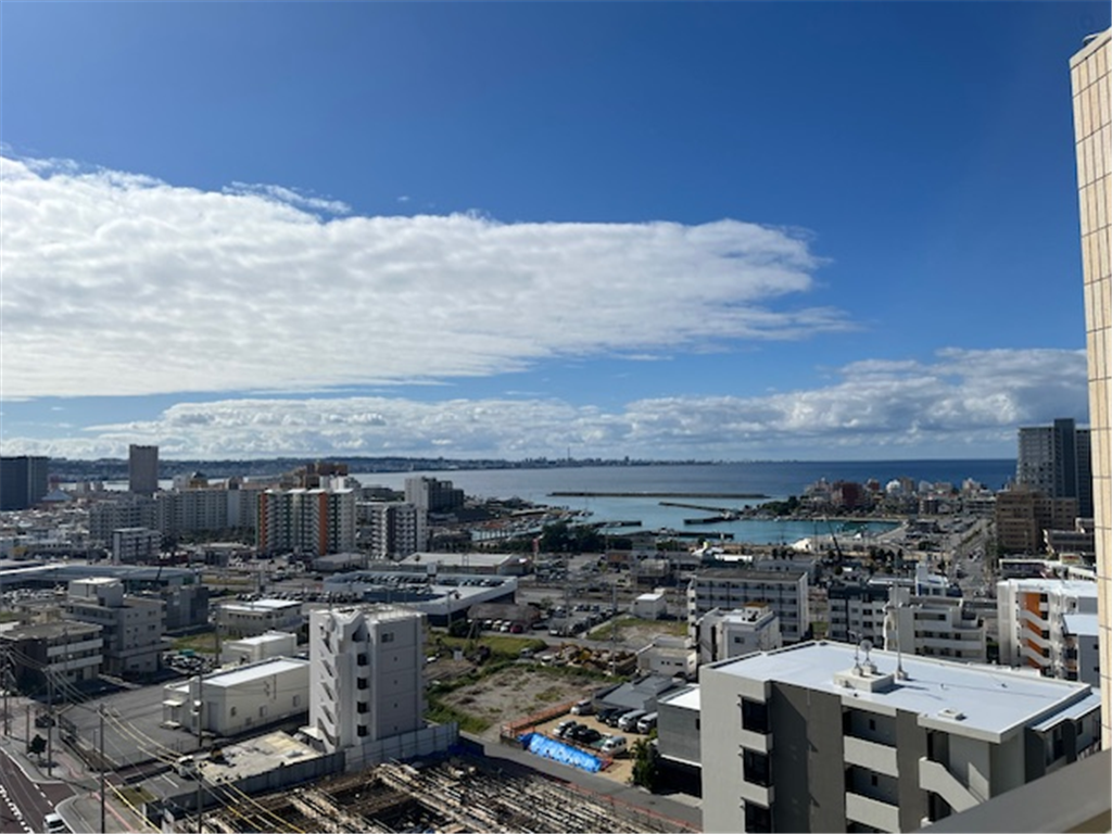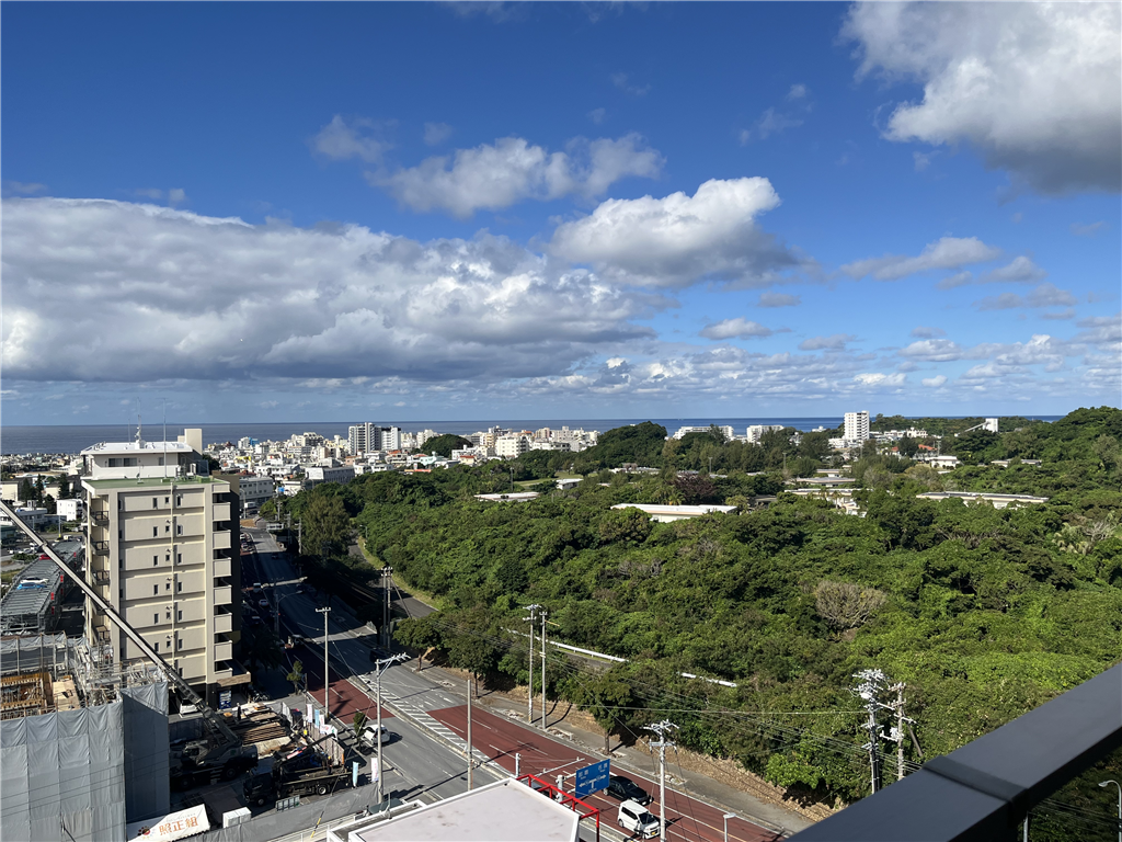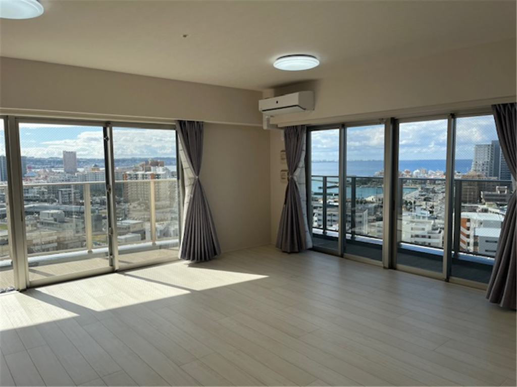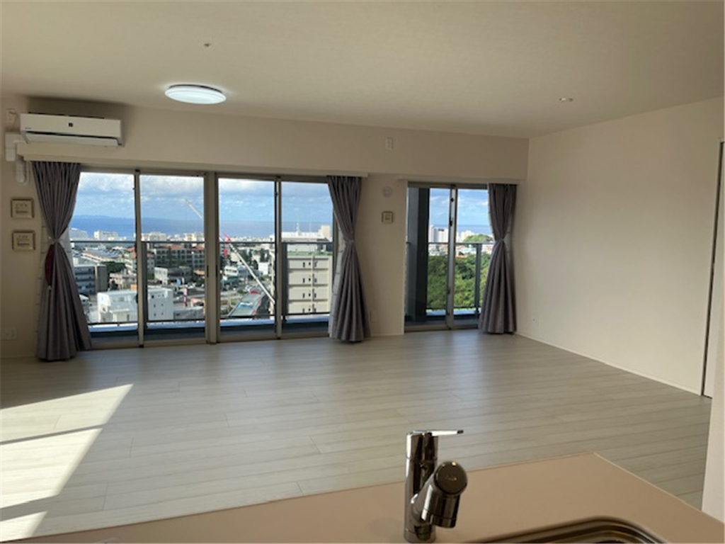 約25.2畳のLDKから北谷町の街並みと東シナ海を一望。