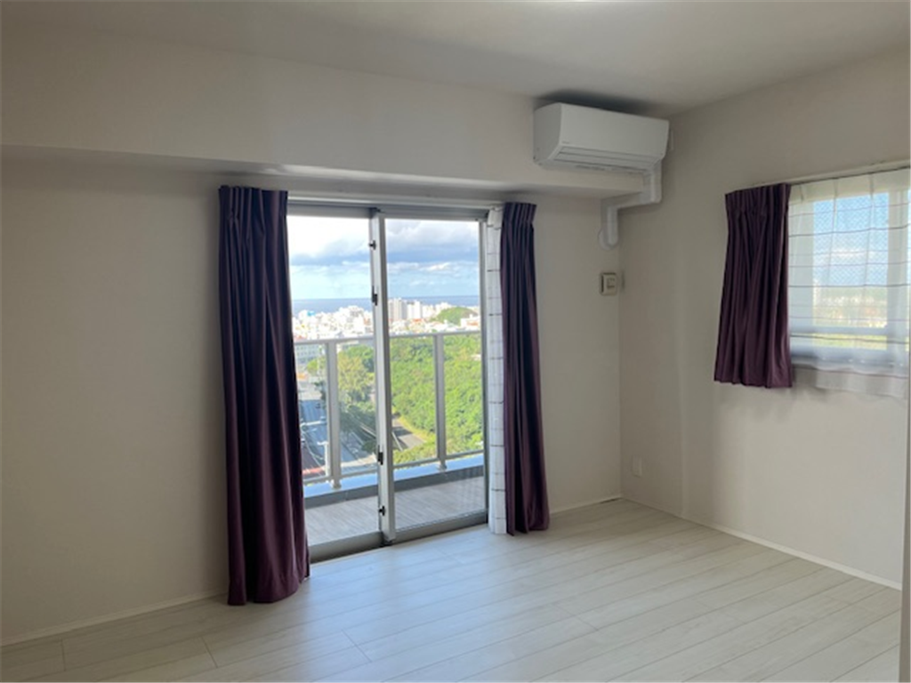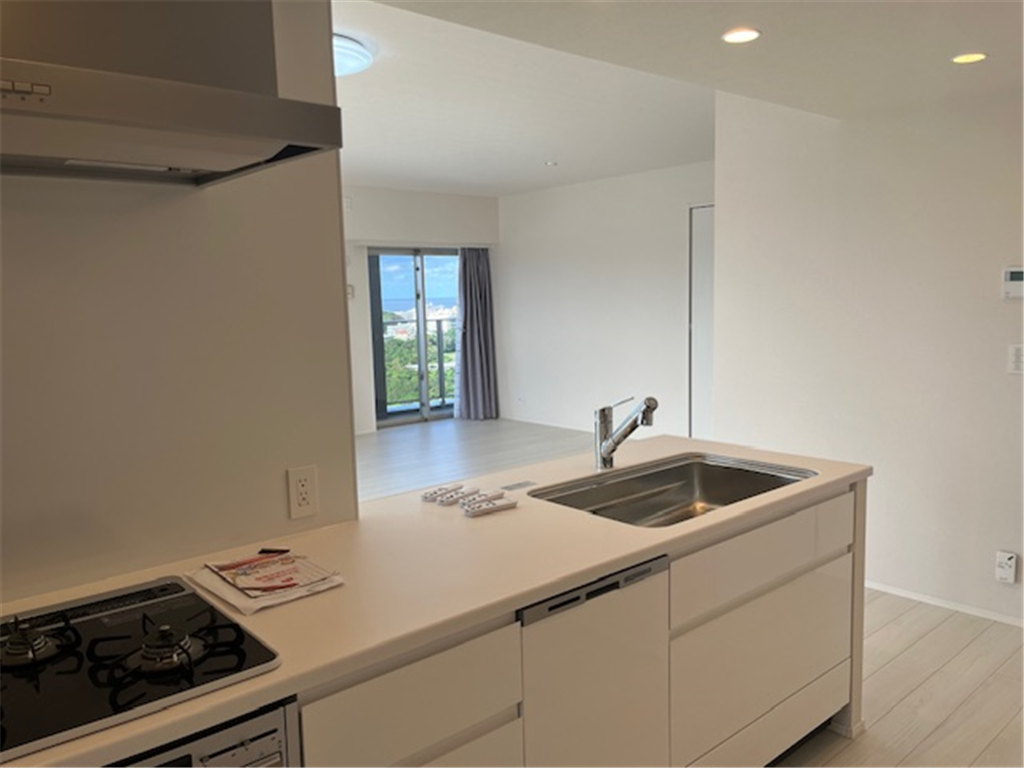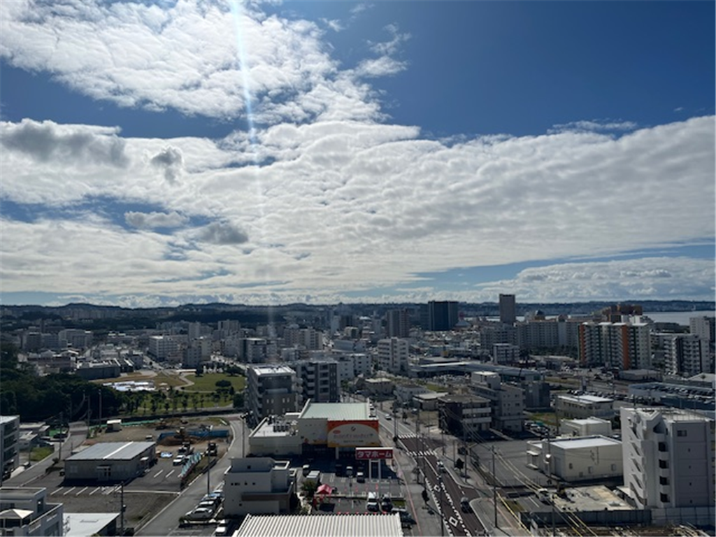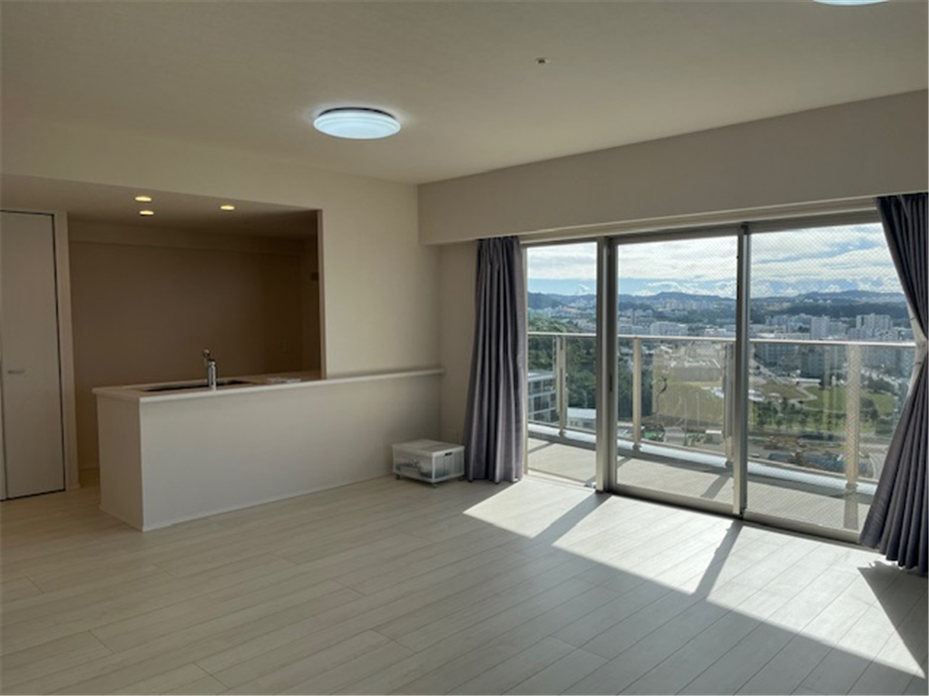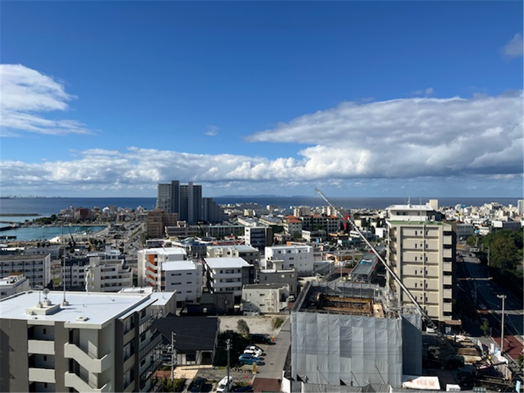 約25.2畳のLDKから北谷町の街並みと東シナ海を一望。