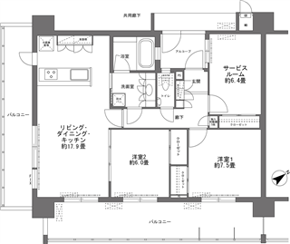 - 間取り:2LDK+サービスルーム 専有面積:84.08m2 階/階建:8階/10階建