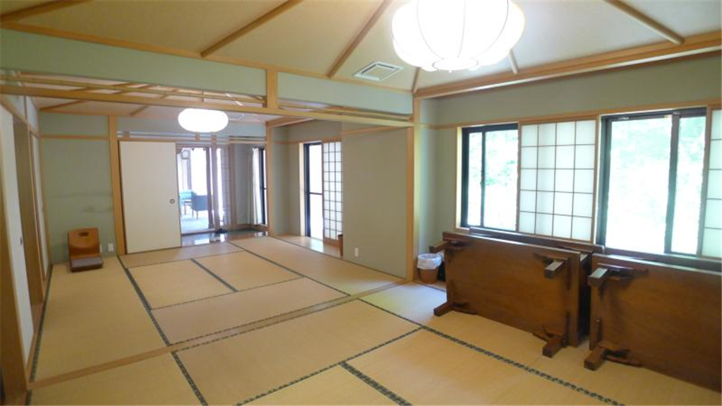 大型の保養所施設です。定期的に室内・敷地内の管理をされ、お手入れが行き届いています。1階の居室と2階の各洋室は南東向きに開口部があり、木漏れ日が室内に差し込む空間設計になっております。