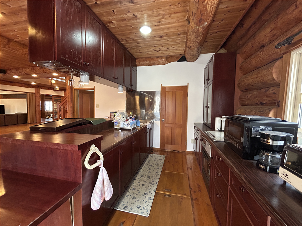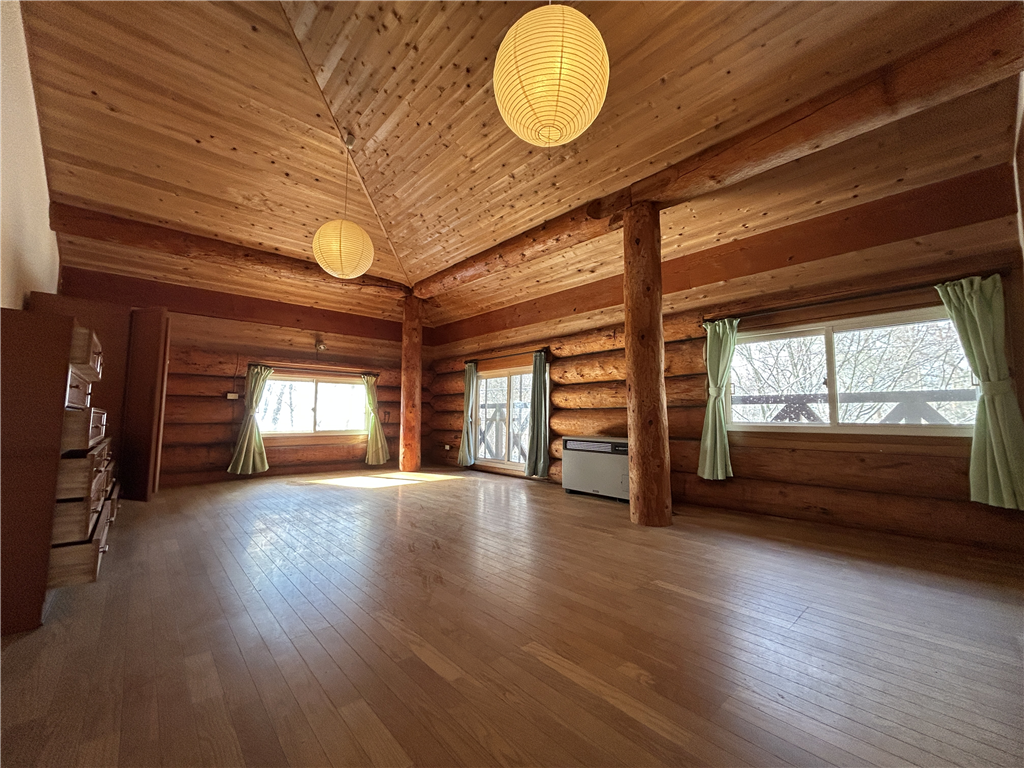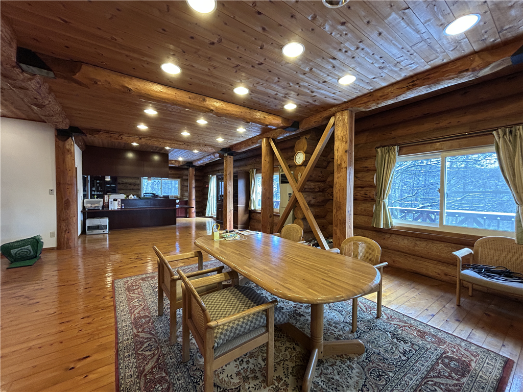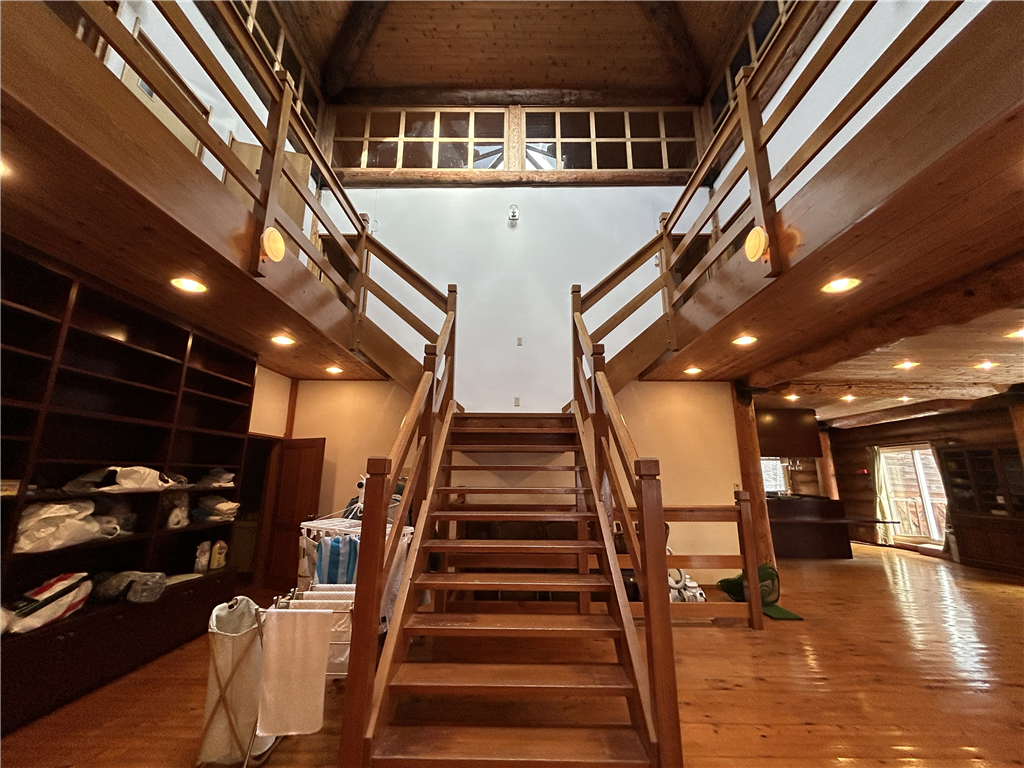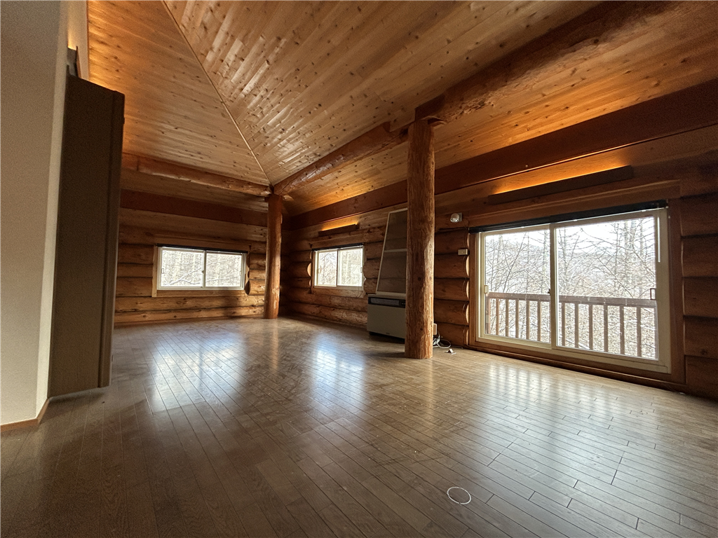 駐車場から玄関までフラットに入れるアプローチ。約63.1畳の開放感のあるLDKがある、丸太組ログハウスとなります。