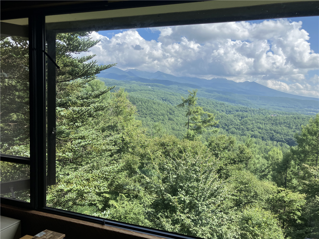 ピクチャーウインドウから八ヶ岳を望むロケーション。温泉大浴場やレストラン等も徒歩利用可能な好立地。(センター地区まで約1.2km)。