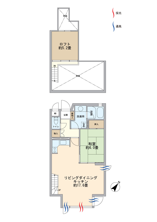 - 間取り:1LDK+ロフト 専有面積:54.43m2 階/階建:2階/2階建