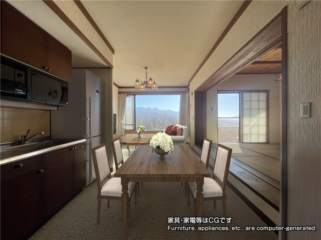 | 注記 | ※2017年7月大規模修繕実施済み(内容:外壁・屋根塗装等)次回大規模修繕2031年予定、当該住戸臨時負担金約433万円予定。(2019年2月作成長期修繕計画書記載の推定修繕工事費累計金額を専有面積割合による按分算出をしております。)ただし修繕積立金の残高は考慮しておらず、工事内容の変更や物価の変動、または修繕積立金の改定等により金額が増減する場合がございます。詳細は、営業担当者へお問い合わせ下さい。 ※東急リゾートタウン蓼科は、土砂災害警戒区域・土砂災害特別警戒区域に指定されています。 ※画像に配置された家具・家電等はCGです。販売対象ではありません。 ※リフォーム・補修等内容は別紙「リフォーム・補修等工事説明書」を参照ください(2026年2月下旬完了予定)。 ※温泉詳細はお問合せください。 |