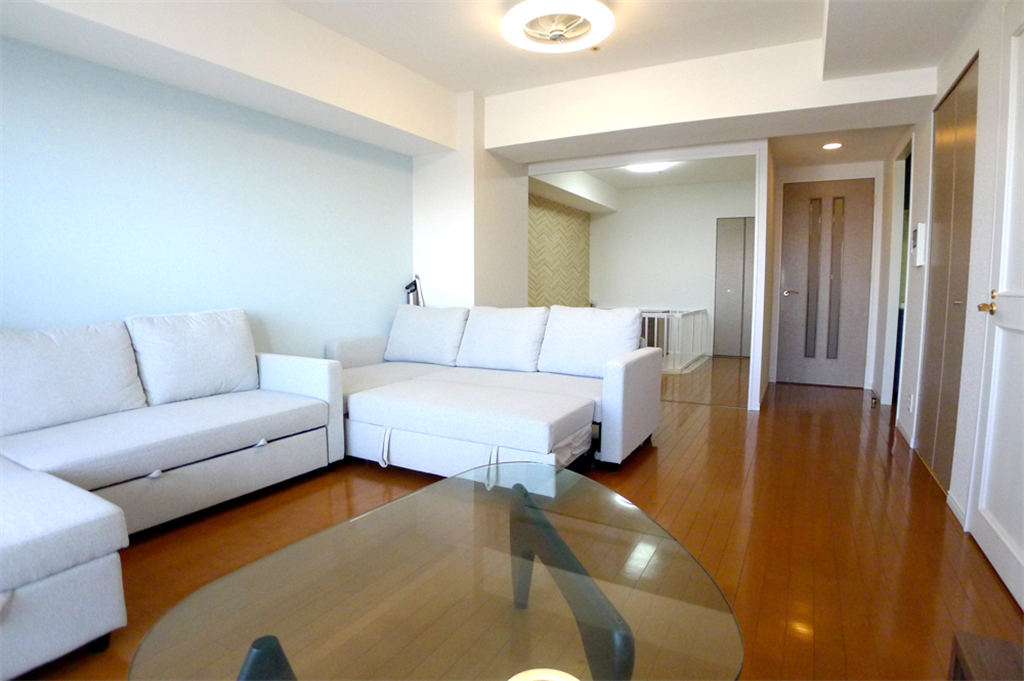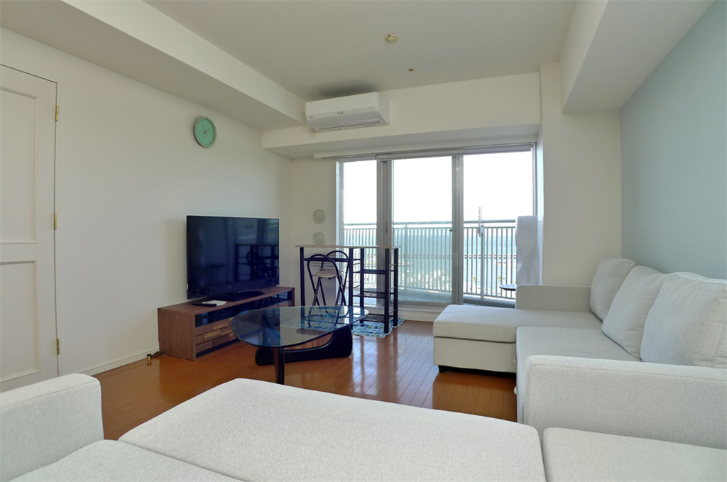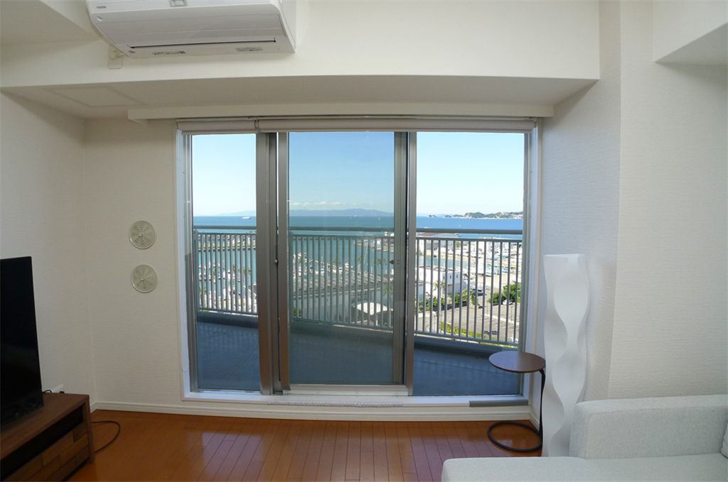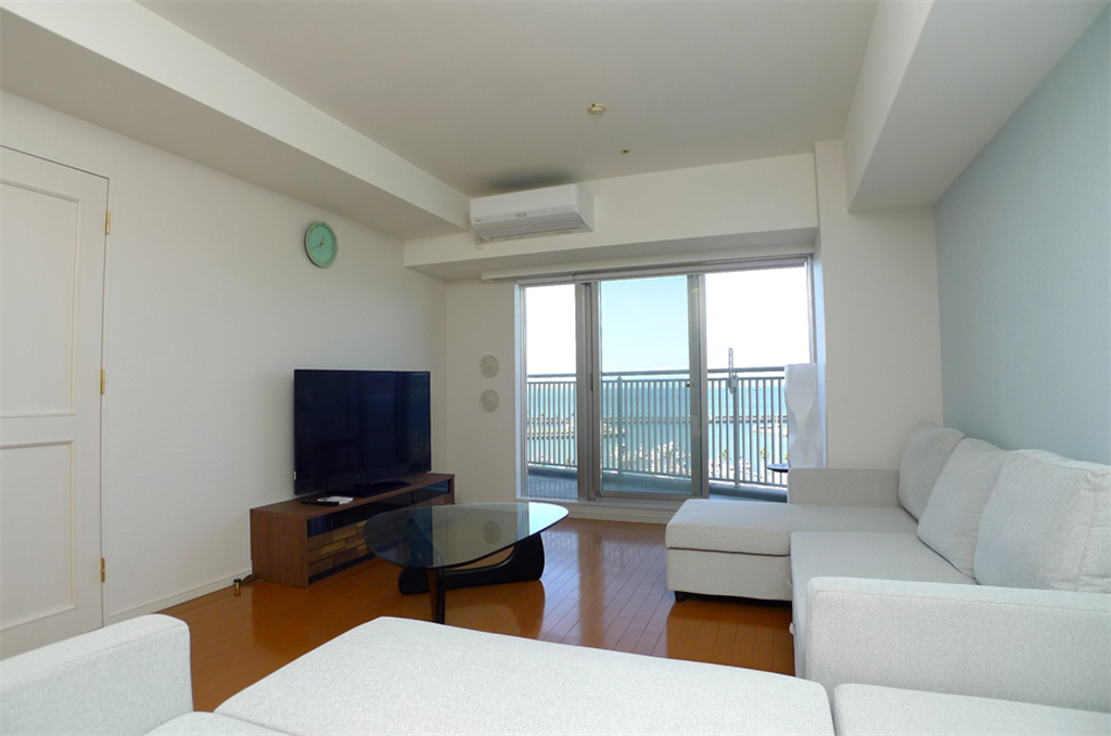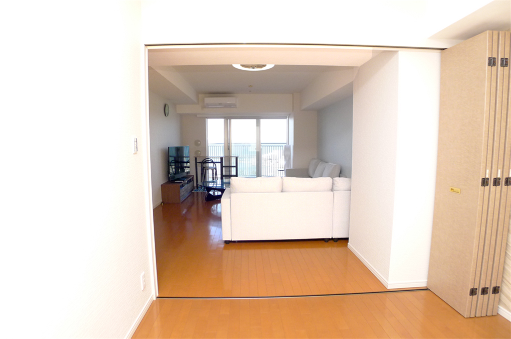 バルコニーに出ると開放的な和歌浦湾の景色が広がり、リビングダイニングやバスルームからも眺望が楽しめる物件です。さらに、快晴時には淡路島までご覧いただけます。室内は洋室とLDKをつなげて1ルームとしてもご利用可能です。