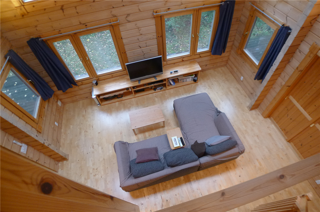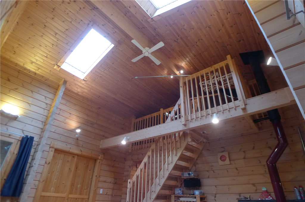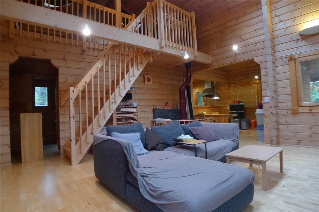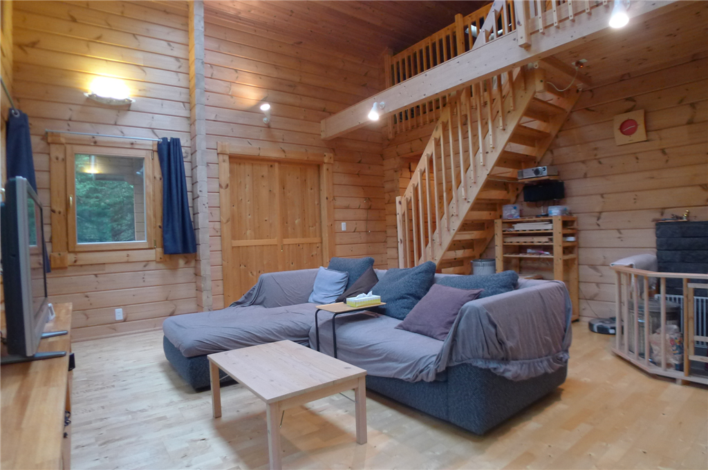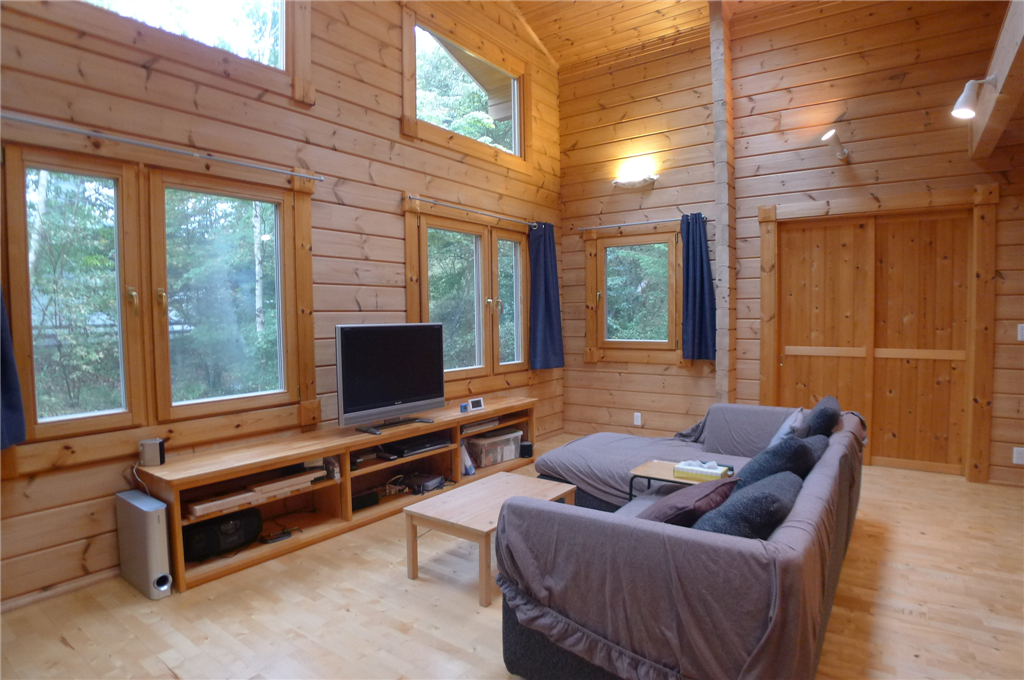 木々に囲まれた2LDK+ロフトの一戸建て(HONKAログ)。LDKには薪ストーブを設置。