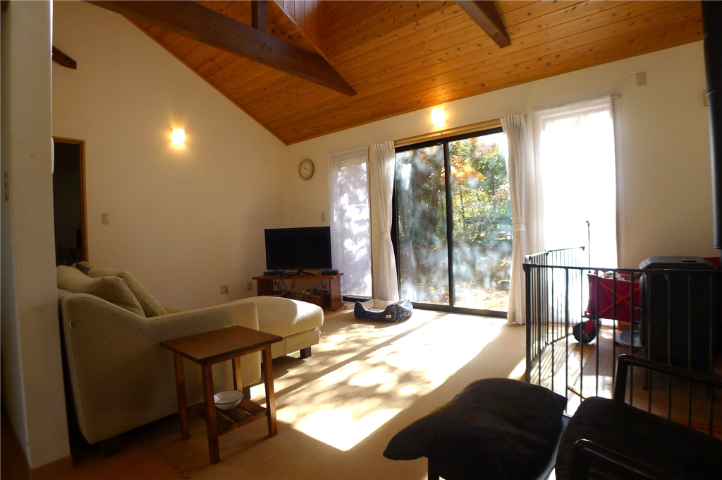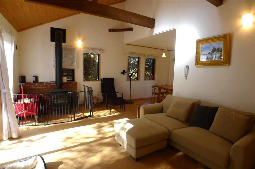 南東向き・勾配天井で開放感のある、薪ストーブ付のリビングダイニングが魅力の3LDK一戸建て。