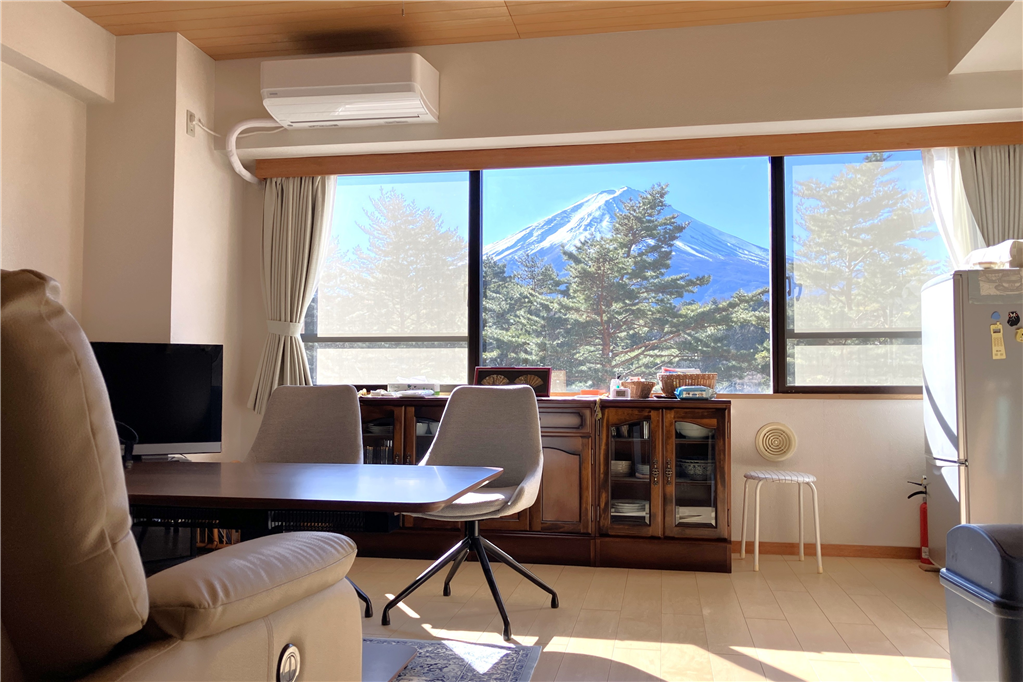 LDKから四季折々の富士山を望めます。周辺には河口湖カントリークラブ(約4.3Km)等のゴルフ施設があるため、前乗りやゴルフ帰りの拠点として楽しめます。