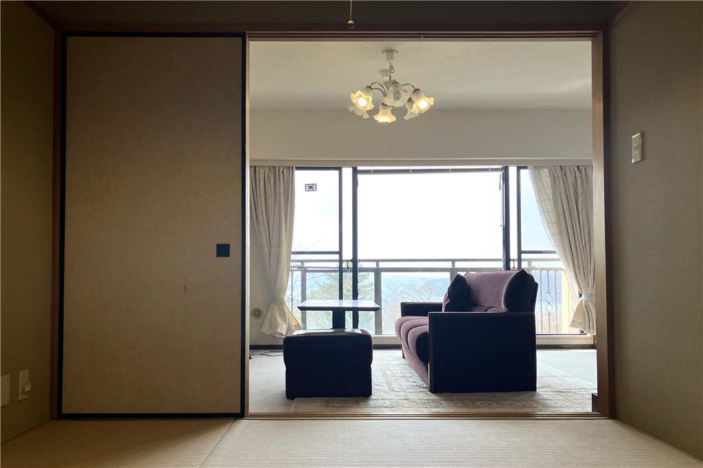開口部は約3.3mあり、明るい印象のお部屋です。冬は樹木の葉が落ち、富士山をよりはっきりとご覧いただけます。